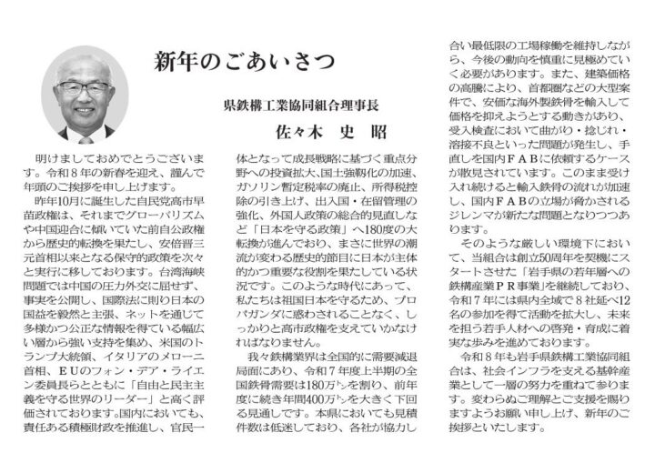 日刊岩手建設工業新聞2026年1月8日号に岩手県鉄構工業協同組合の理事長を務める弊社佐々木社長の新年の挨拶記事が掲載されておりますので、出版社の許可を得てご紹介させていただきます。