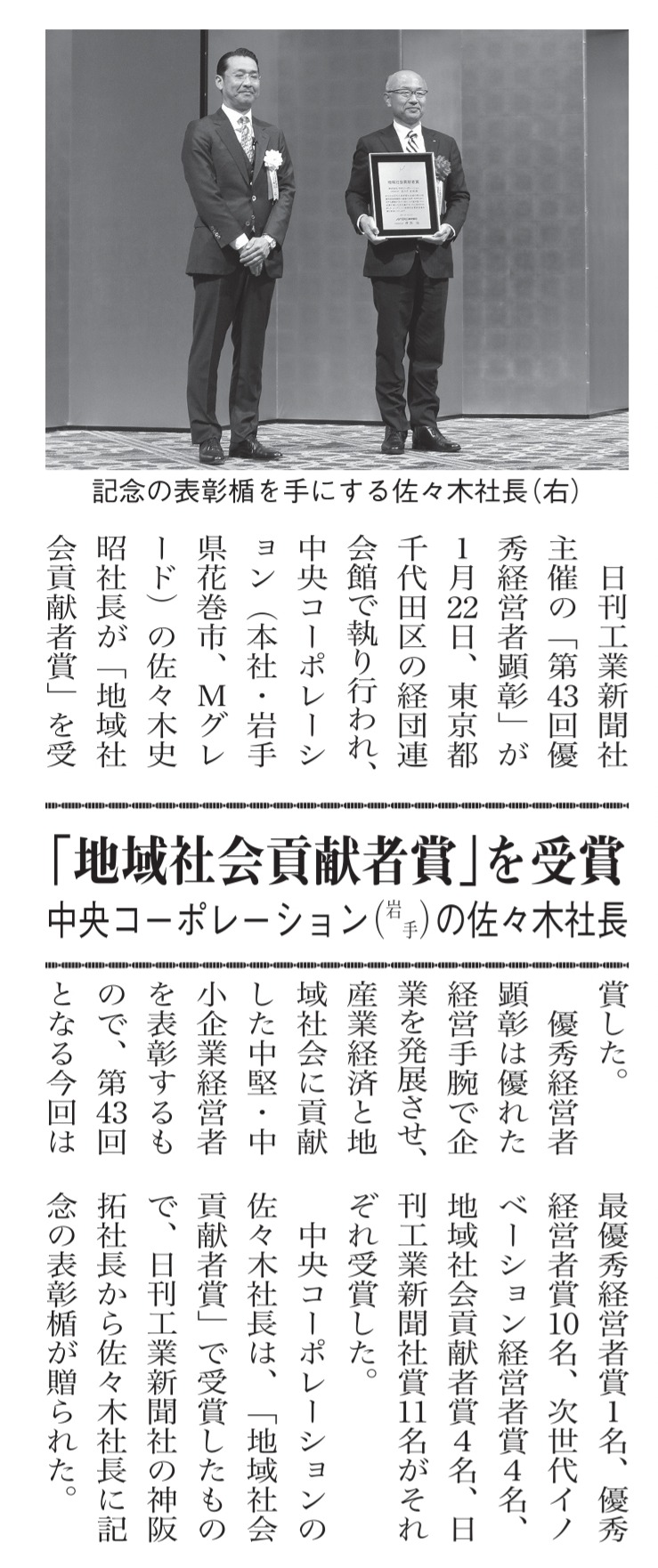 株式会社鋼構造出版より刊行されております「週刊 鋼構造ジャーナル」2026年2月2日号 NO.2277に、日刊工業新聞社主催 「第43回優秀経営者顕彰・地域社会貢献者賞」を当社佐々木社長が受賞した記事が掲載されておりますので、出版社の許可を得てご紹介させていただきます。