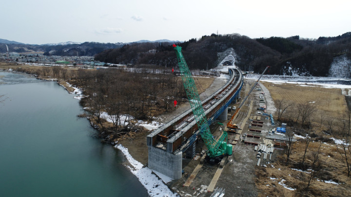 『一般国道106号宮古西道路(仮称)閉伊川横断橋上部工工事』の架設状況を御紹介します。