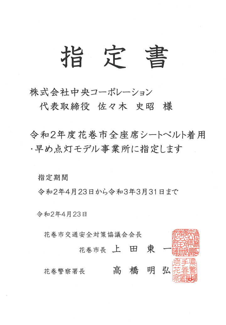 「令和2年度花巻市全座席シートベルト着用・早め点灯モデル事業所」に指定されました。