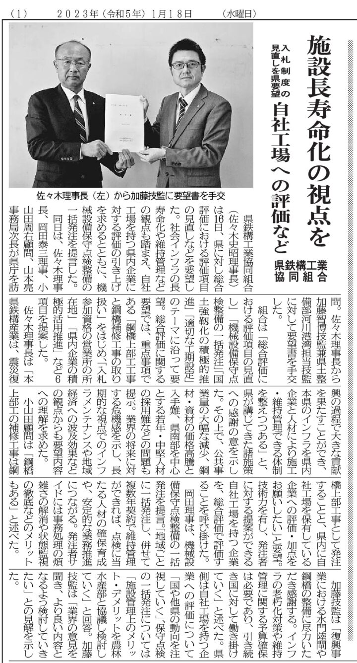 弊社佐々木社長が理事長を務める岩手県鉄構工業協同組合は、岩手県に対して総合評価における評価項目の見直しなどを要望いたしました。 日刊岩手建設工業新聞2023年1月18日号に記事が掲載されておりますので、出版社の許可を得てご紹介させていただきます。