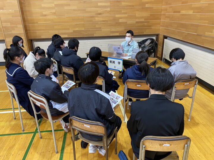 1月24日(火)、NPO法人未来図書館が主催している「未来パスポート」プロジェクトに弊社工務部工務課岩渕課長代理が参加いたしました。今回は花巻市立花巻中学校1年生146名を対象に、岩渕課長代理を含む社会人15名が講師となり、自分の経験、仕事の内容ややりがいなどを小グループ毎に生徒さんにお話いたしました。