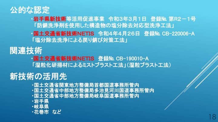 受賞企業を代表して、弊社総務部次長の猪狩が事業計画「耐食性を付与した環境負担低減型塗膜除去技術の開発」の概要についてプレゼンテーションを行いました。