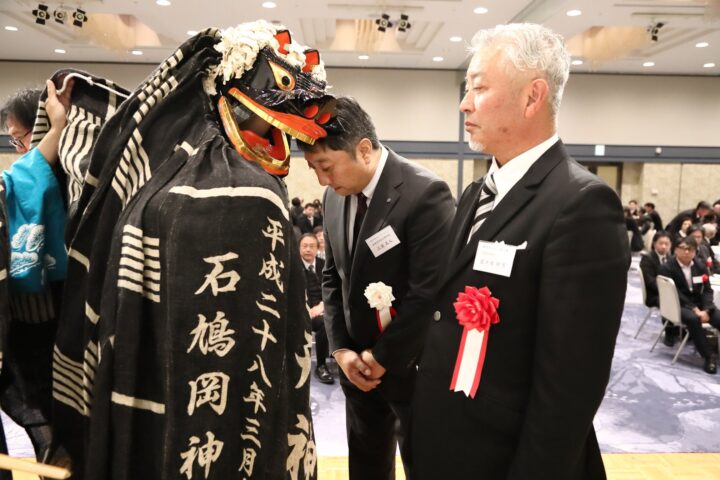 演舞の中では当社佐々木社長をはじめ、数名の当社管理職・協力会社の方々の頭を獅子舞に噛んでいただき、安全祈願と商売繁盛を祈願しました。
