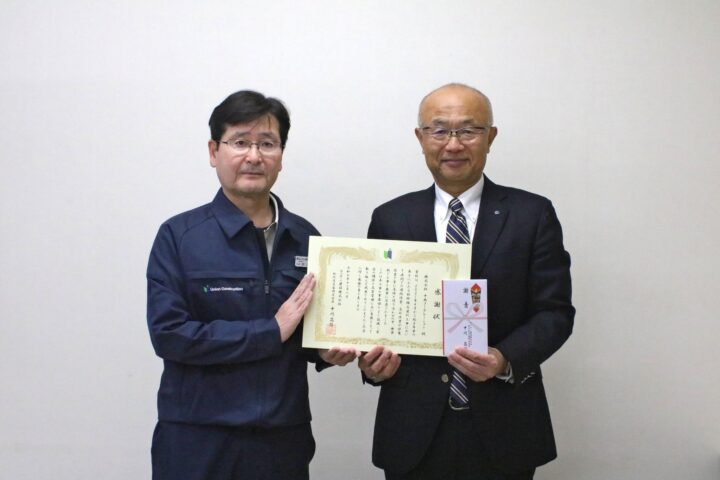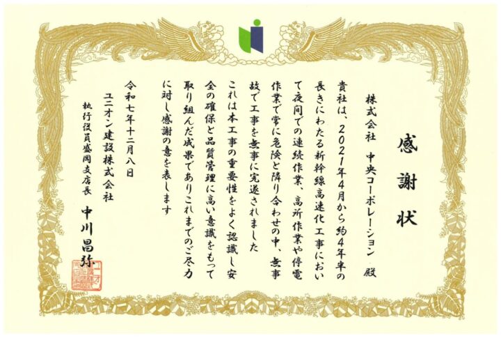 当社はこの度、2021年4月から約4年半にわたり実施された新幹線高速化工事において、協力会社として夜間作業・高所作業・停電作業など危険を伴う作業の中、無事故で工事を完遂したことが評価され、ユニオン建設株式会社様より感謝状を贈呈いただきました。