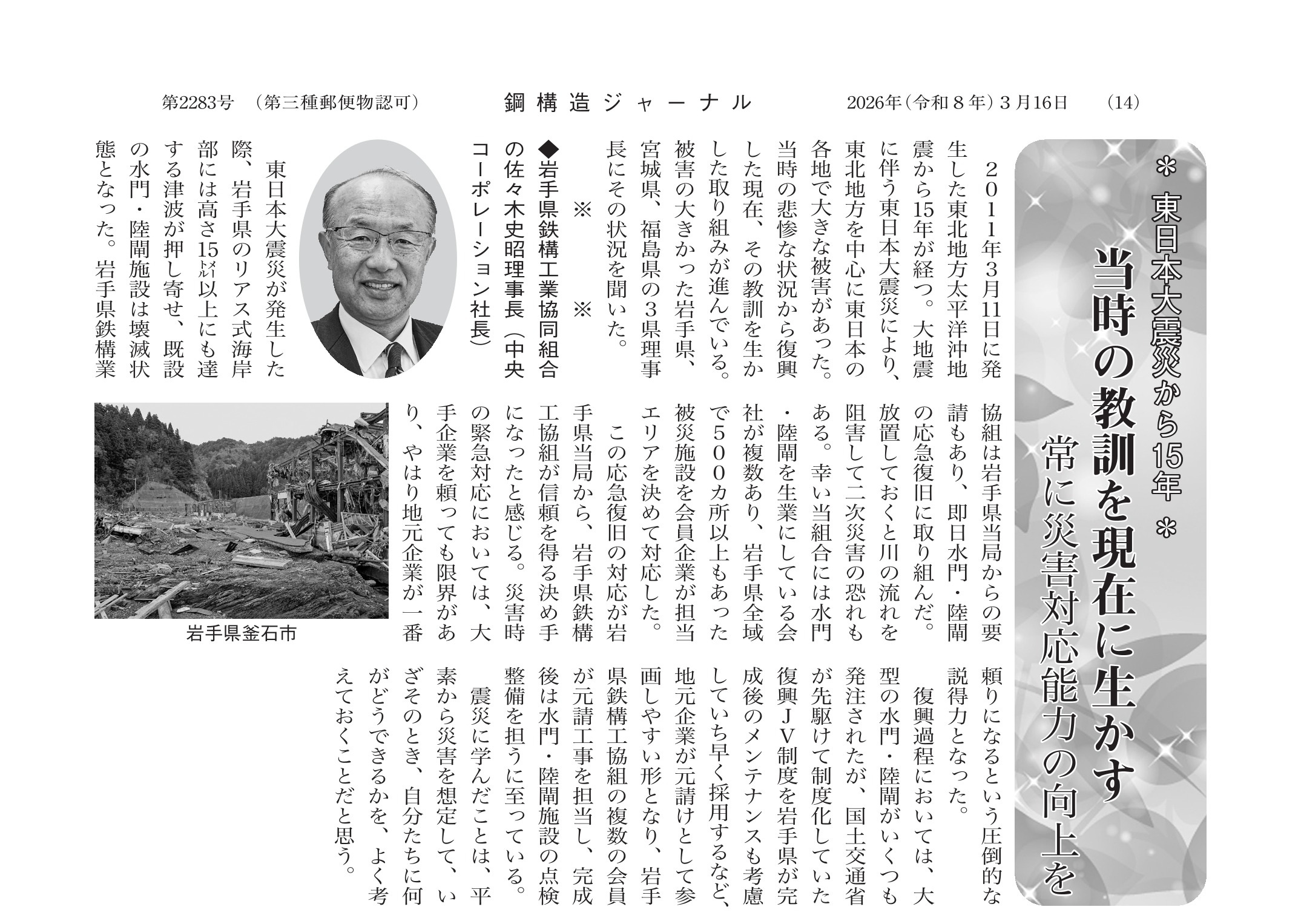 株式会社鋼構造出版より刊行されております「週刊 鋼構造ジャーナル」2026年3月16日号NO.2283に、岩手県鉄構工業協同組合の理事長を務める当社佐々木社長の記事が掲載されております。出版社の許可を得てご紹介させていただきます。