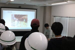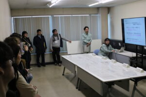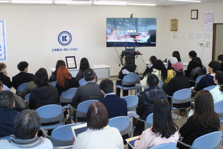 はじめに佐々木社長から当社の歴史や事業について説明し、その後当社のPR動画を見ていただき、当社への理解を深めていただいた上で、事務所内や工場を見学していただきました。